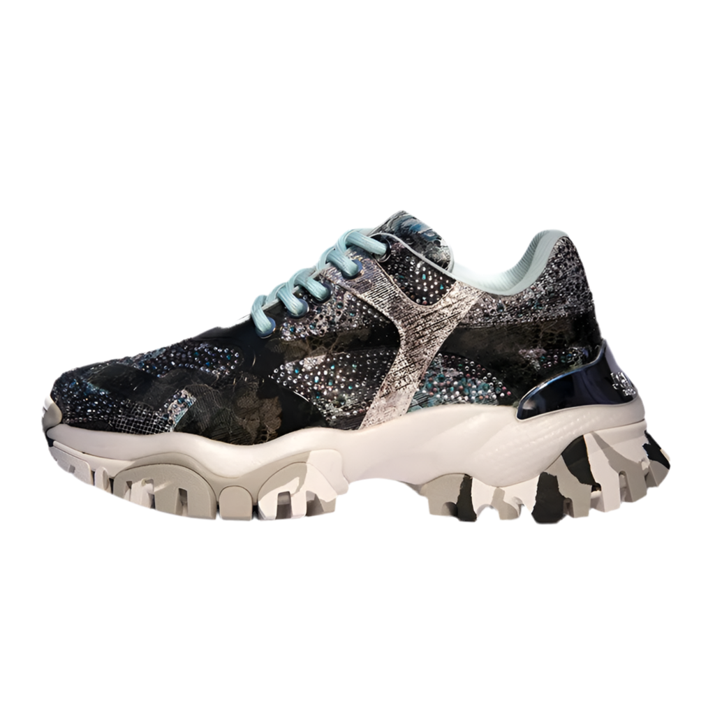 Sneaker Joia Paris si distingue per la sua forma unica e l'uso dei materiali contrastanti combinano modernità e creatività. L'interno della sneaker è foderato in tessuti traspiranti che conferiscono al piede il massimo comfort. Sneaker base tessuto tema floreale con applicazioni multistrass, inserti in pvc e pelle stampata, fodera in tessuto e suola in gomma. Con inserto effetto metallico posteriore.