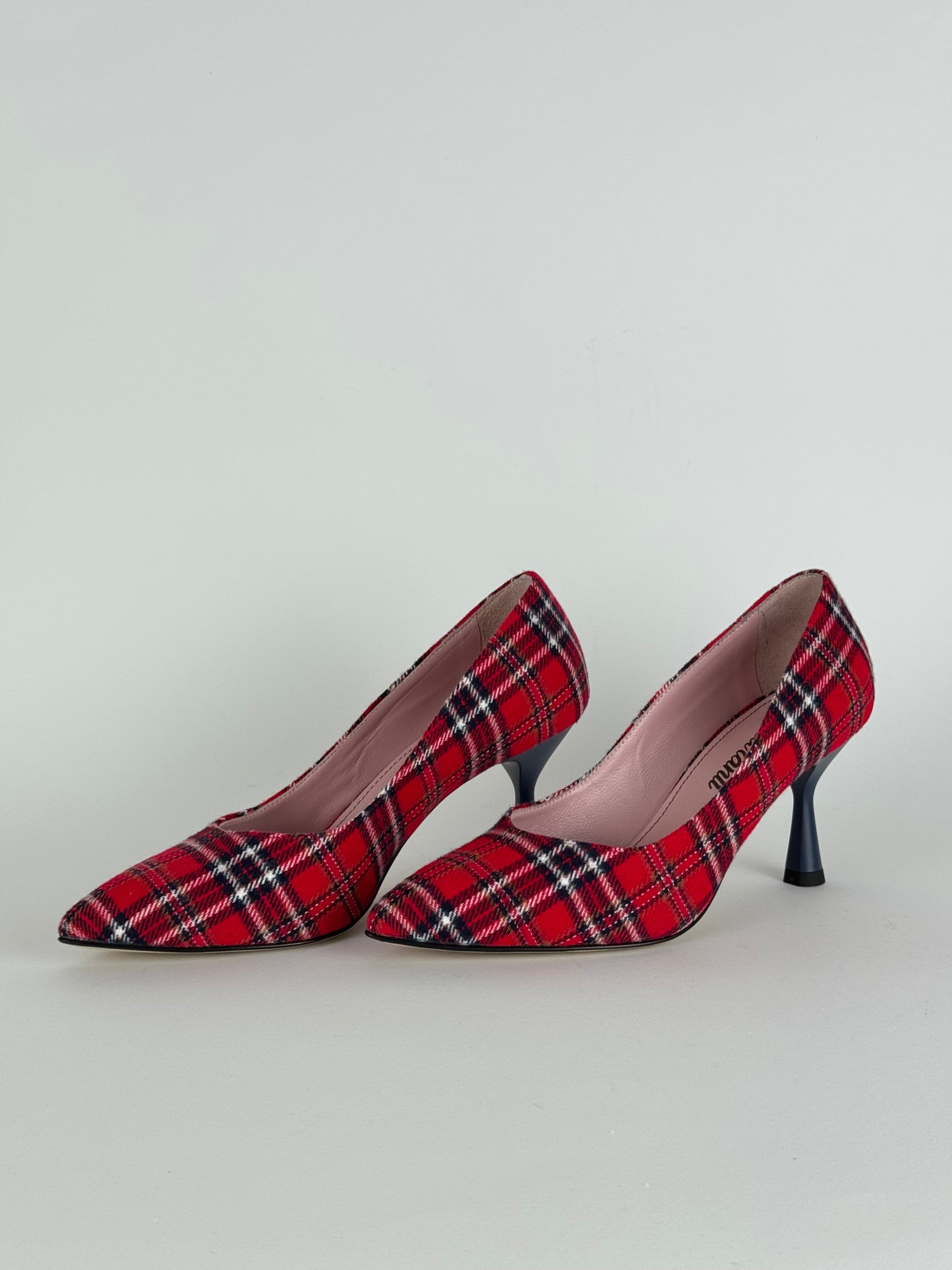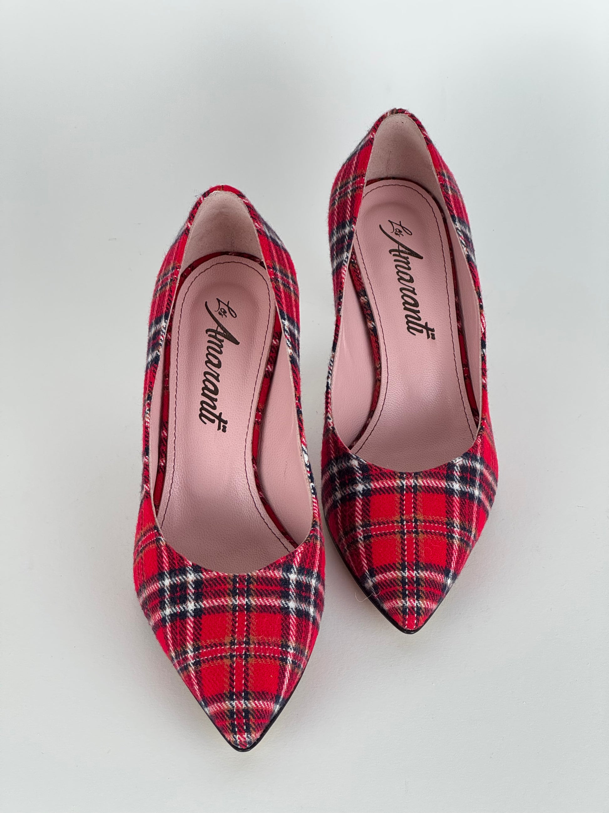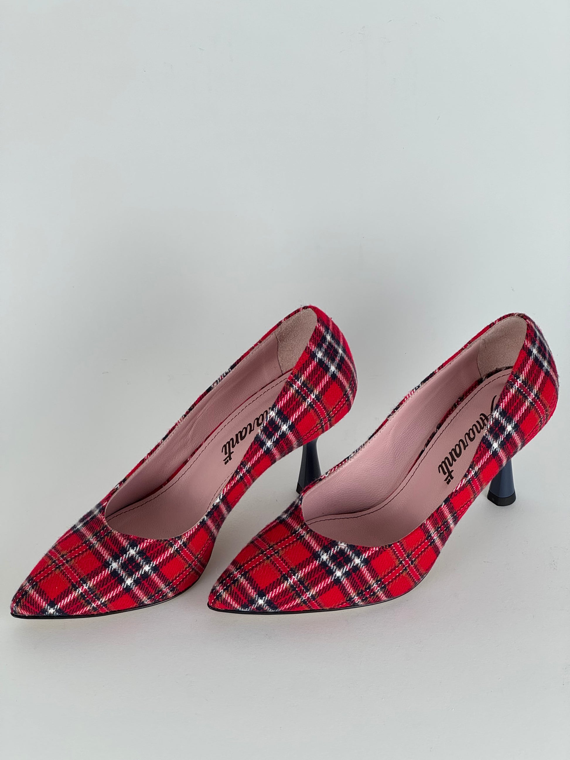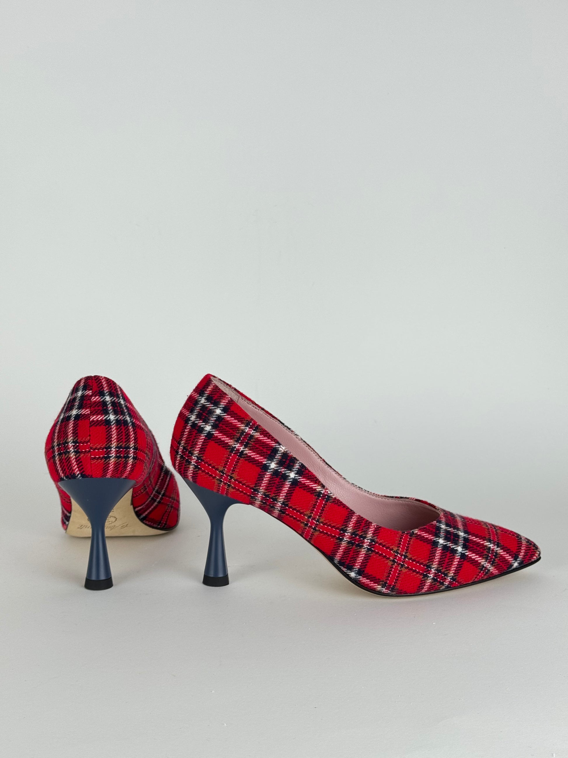 La decolletè Les Amaranti è un capolavoro di artigianato in tessuto loden rosso con tacco 7 cm, ideale per mantenere un look elegante e mai troppo formale.