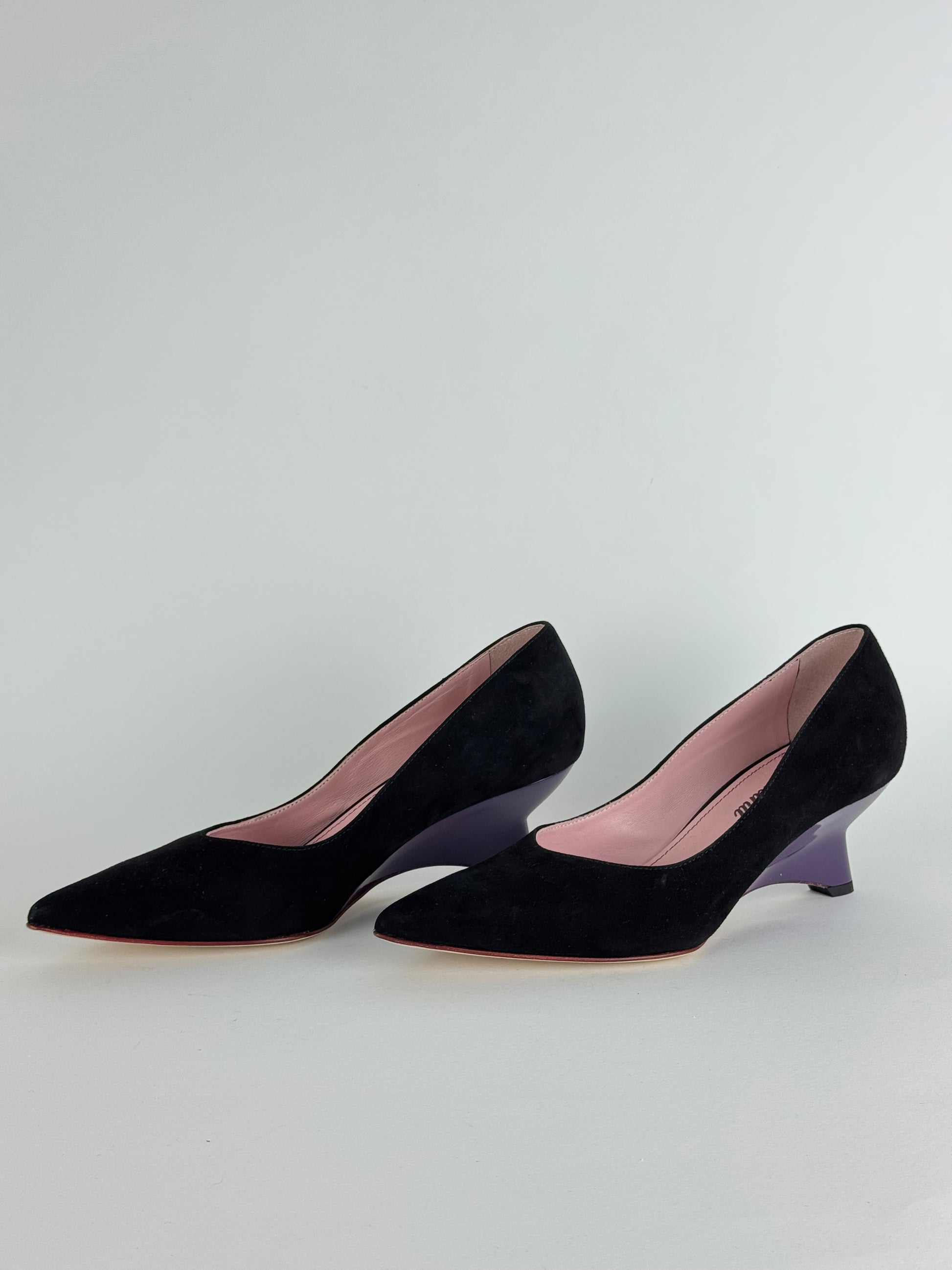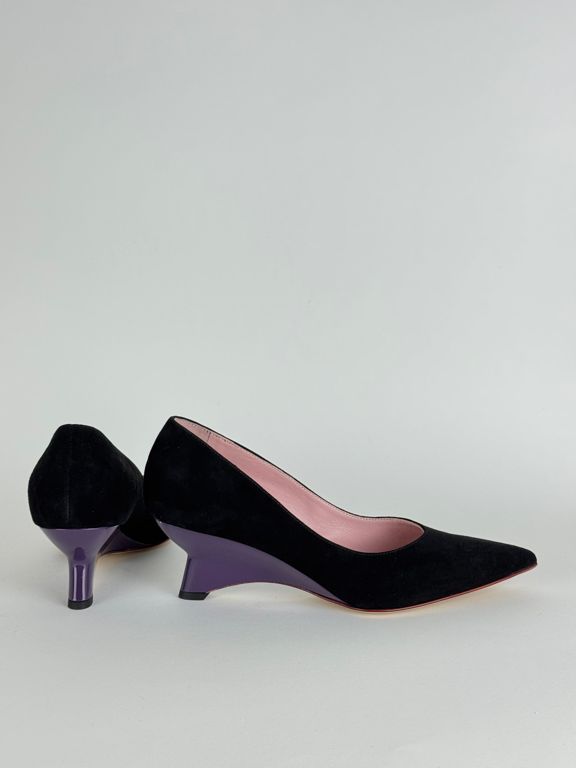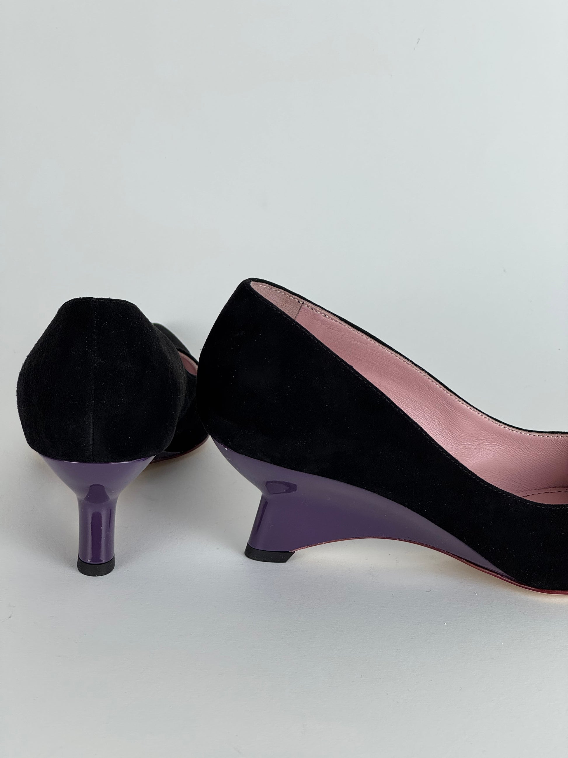 Décolleté Les Amaranti realizzata in camoscio nero con zeppa viola 5 cm, ideale per tutte coloro che vogliono unire eleganza e funzionalità in ogni situazione.