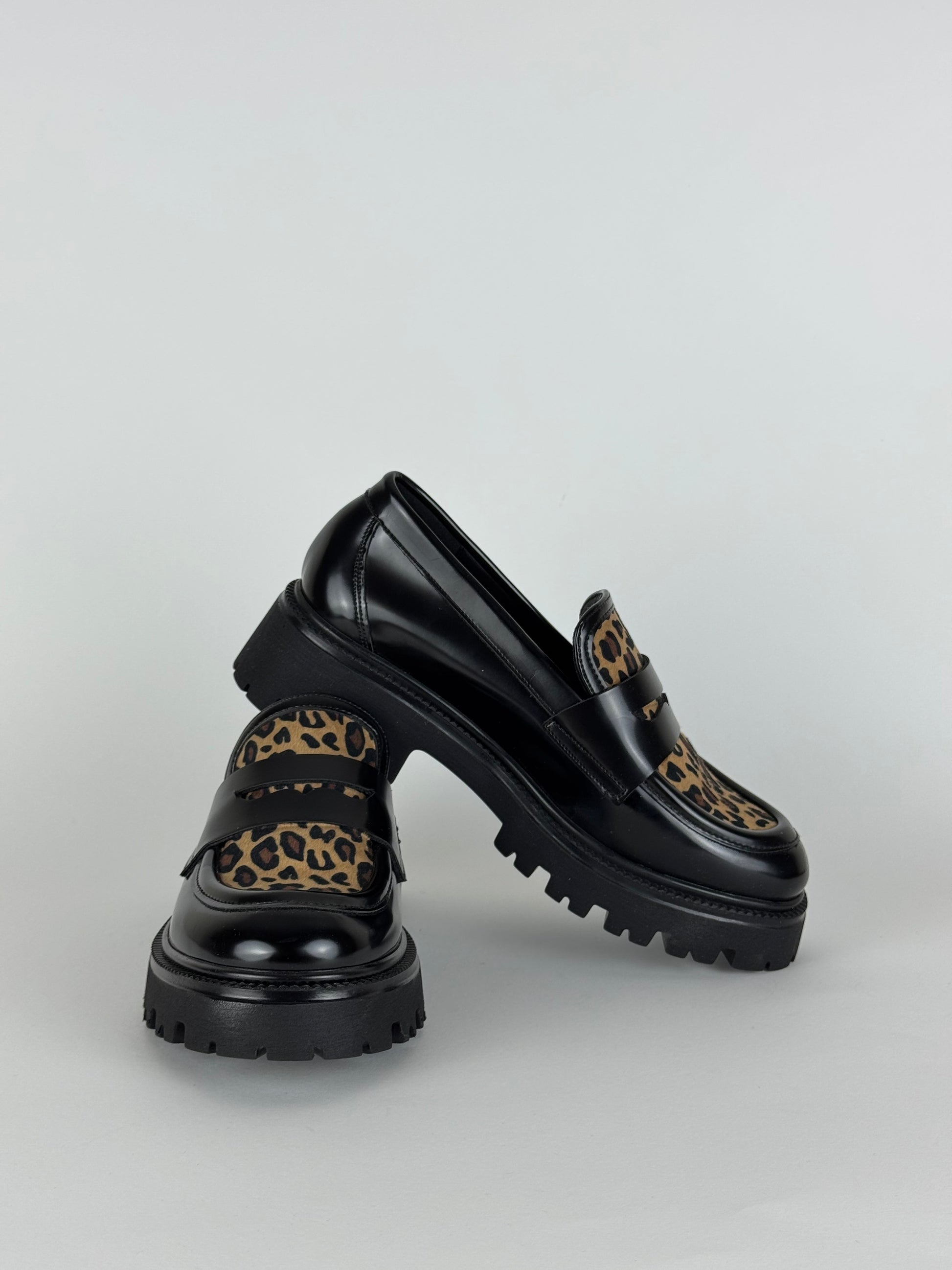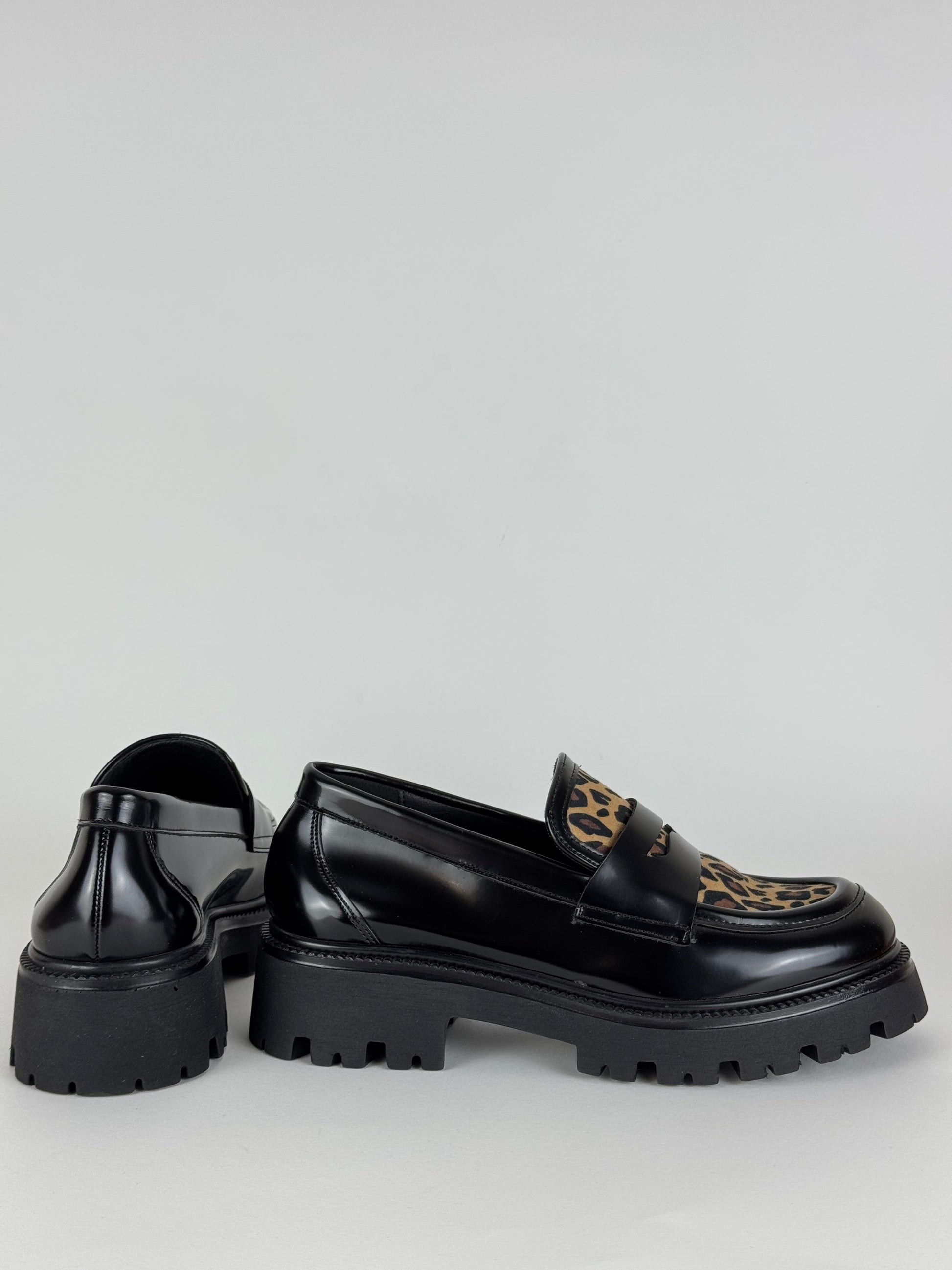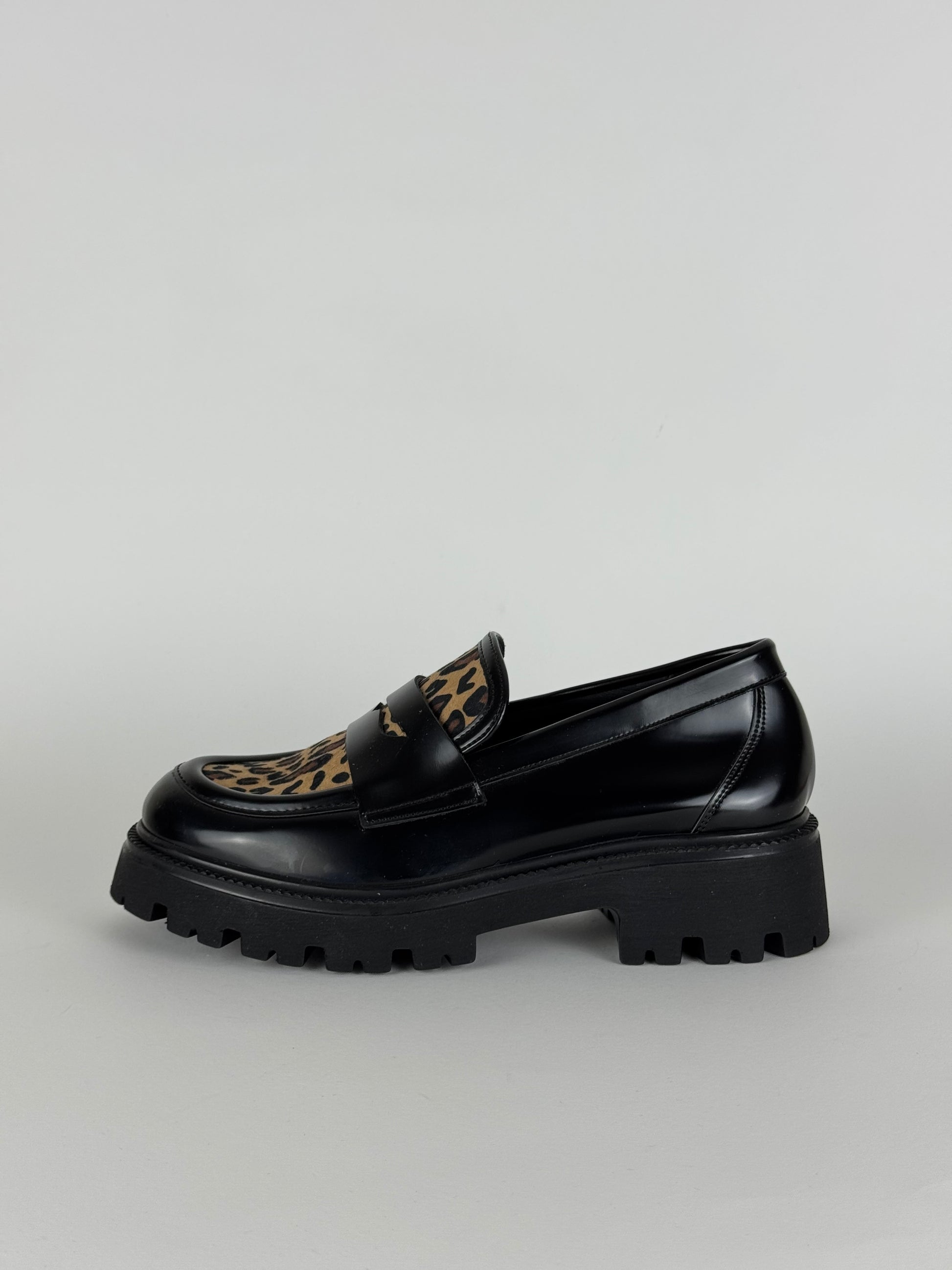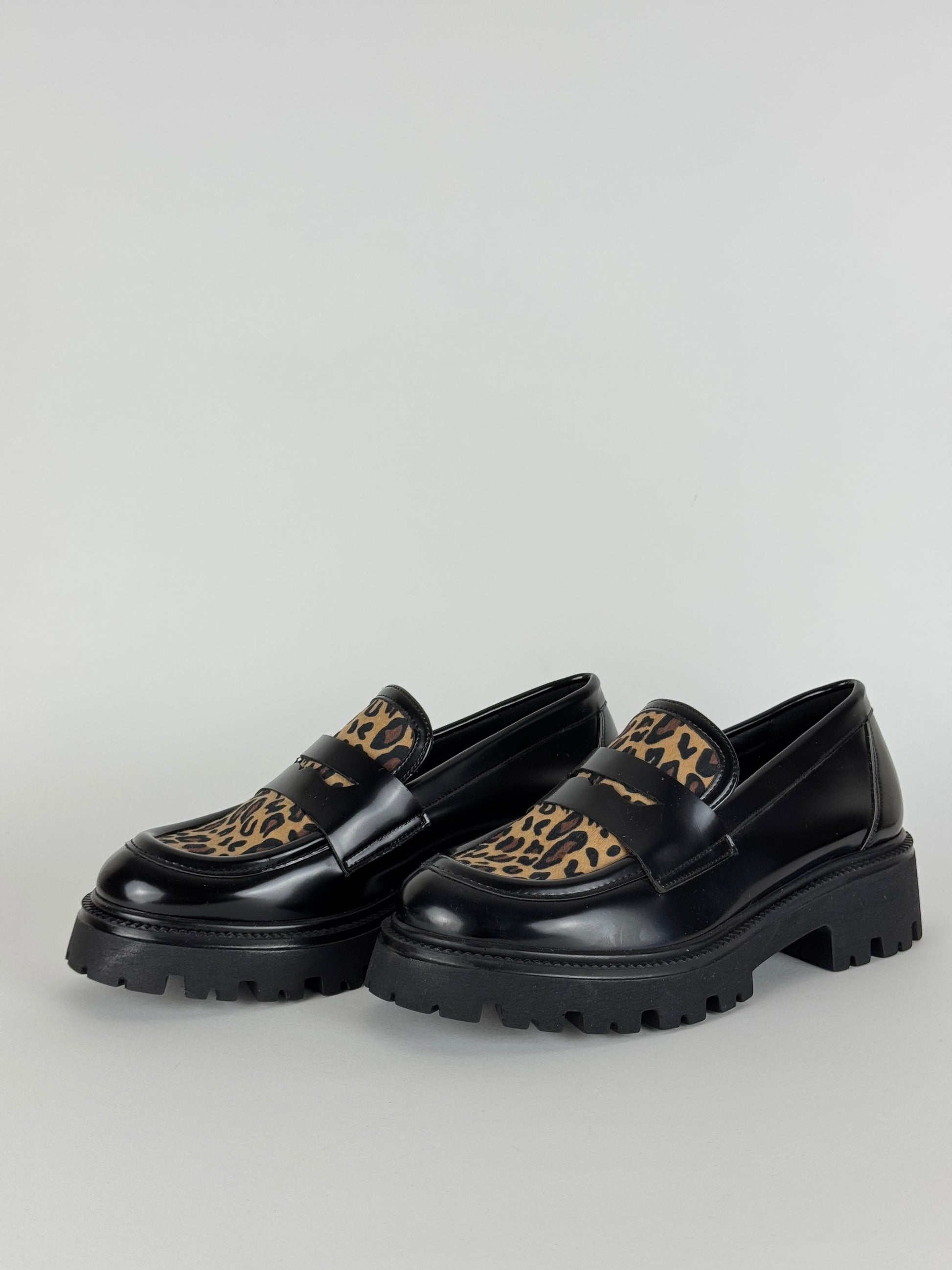 Mocassino Nacree realizzato in eco pelle con tessuto sintetico maculato. La suola in pelle garantisce un comfort ottimale ad ogni passo.