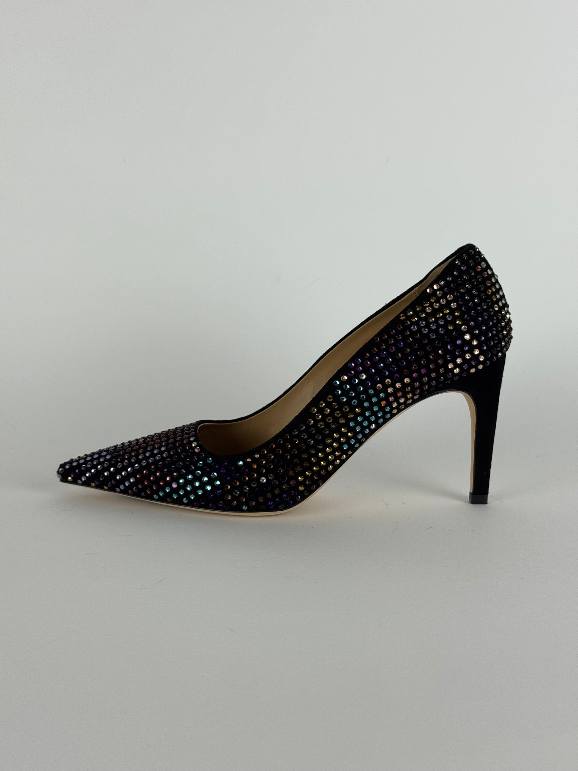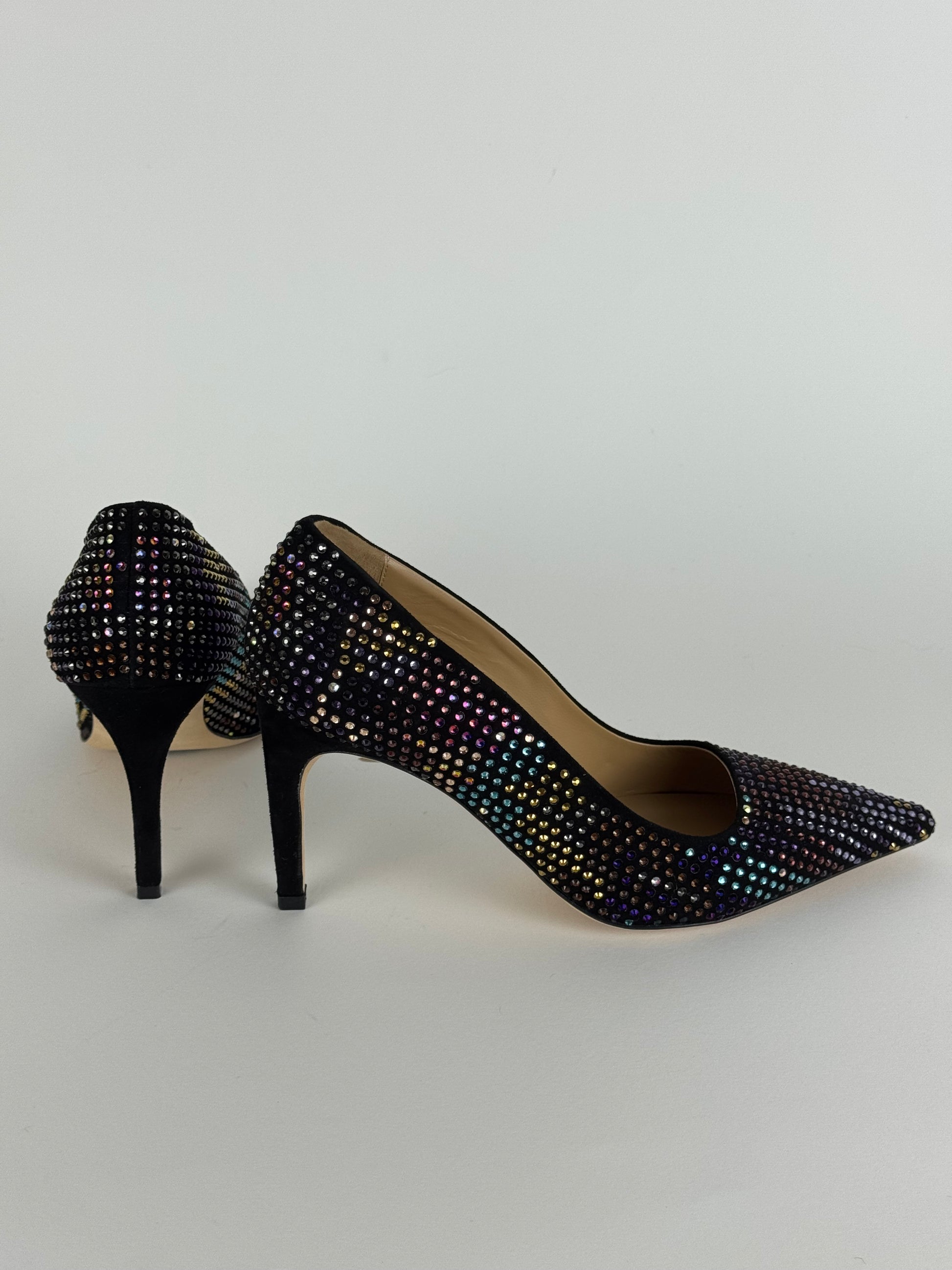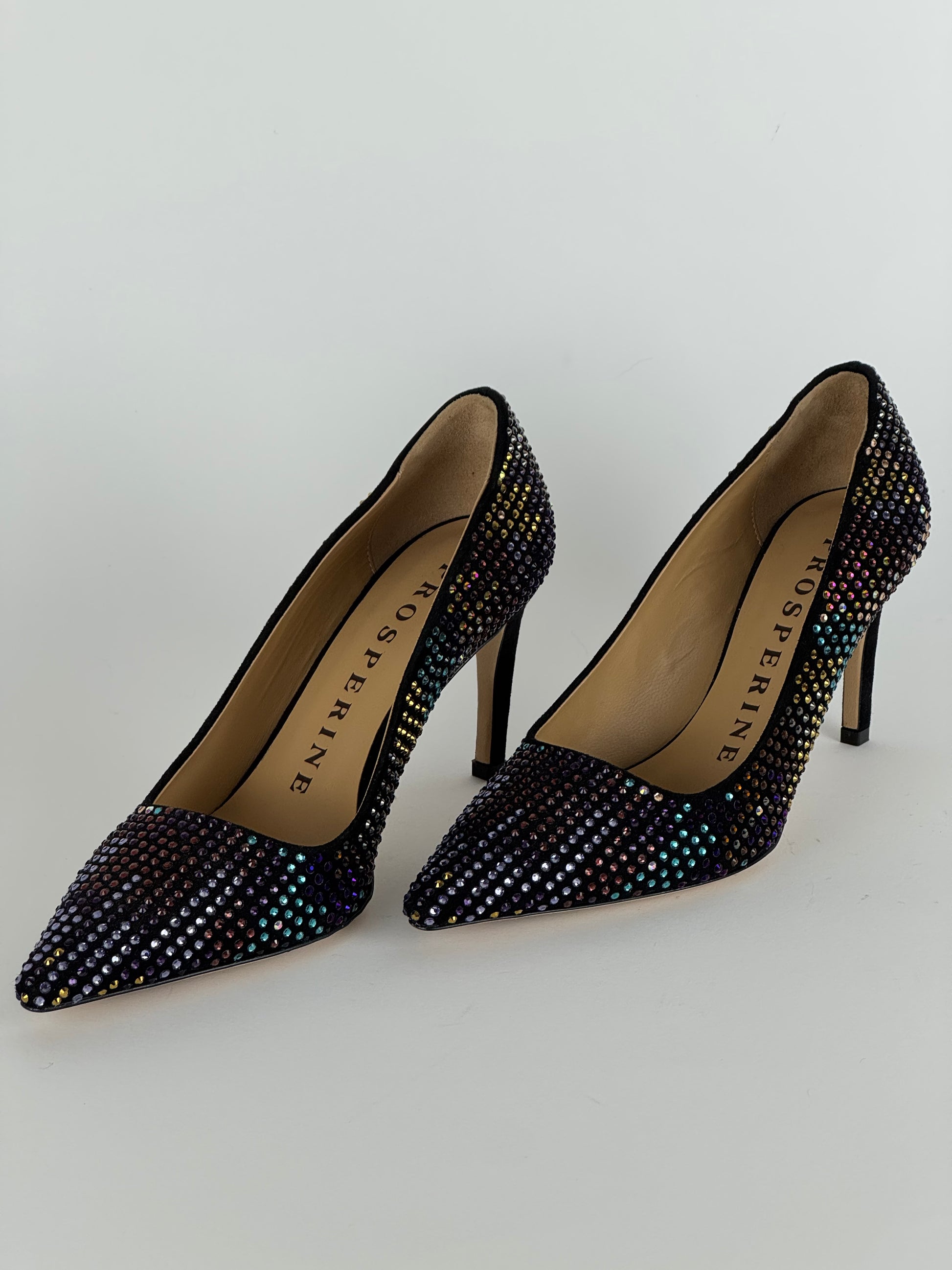 Decolletè Prosperine con tacco 8 cm ricoperto di glitter diamond, pensata per chi vuole aggiungere un tocco glamour e sensuale al proprio look serale. Questa scarpa è perfetta dove ogni dettaglio conta e la lucentezza è fondamentale. La tomaia è realizzata con materiale tessile finemente lavorato e ricoperta da brillantini scintillanti che creano un effetto luminoso e sofiisticato.