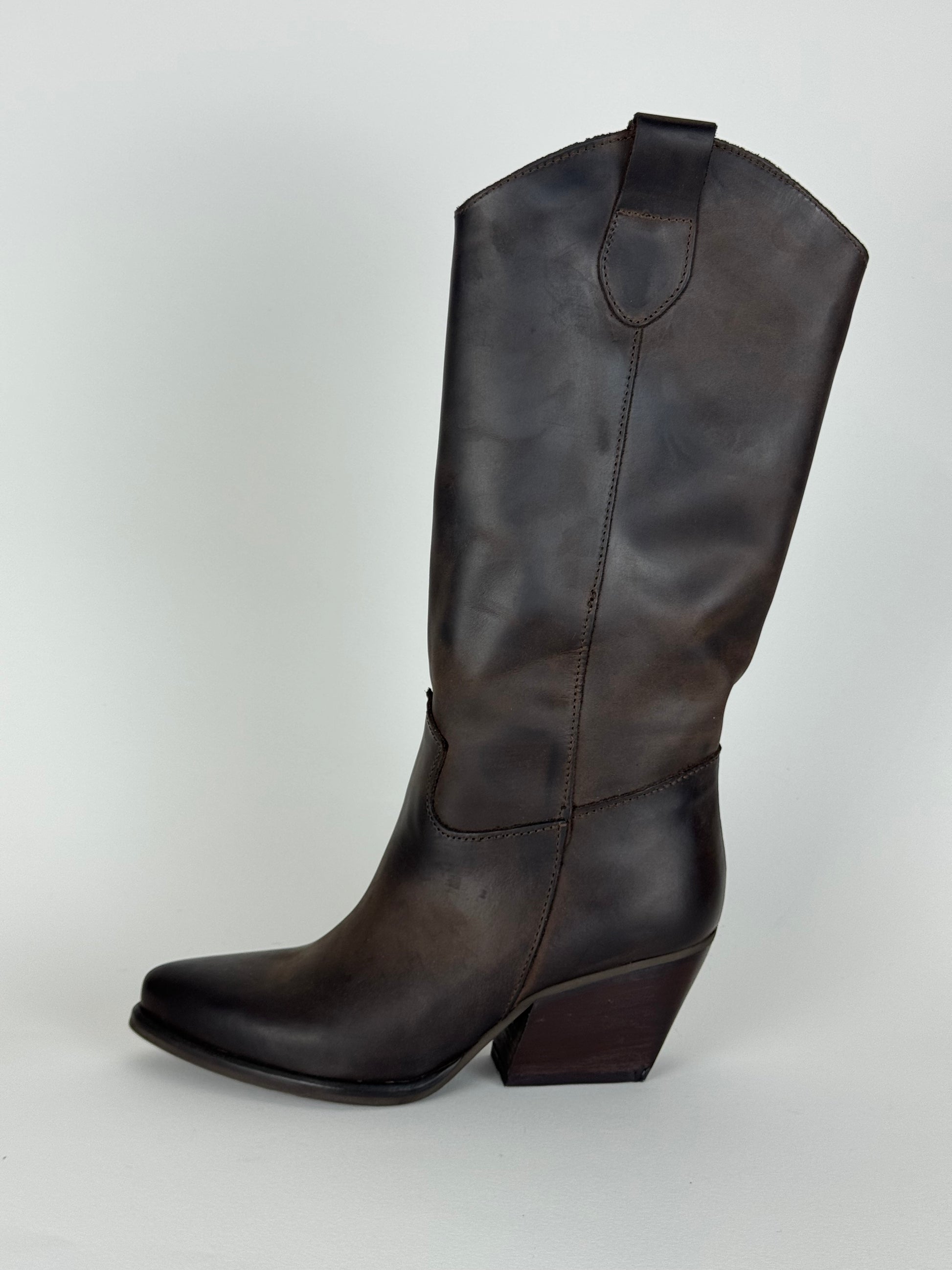 Aggiungi un tocco di carattere western al tuo look con questo stivale texano in pelle. Realizzato in pelle liscia marrone, presenta un design essenziale e senza tempo, con punta leggermente affusolata e tacco largo inclinato che garantisce comfort e stabilità.
