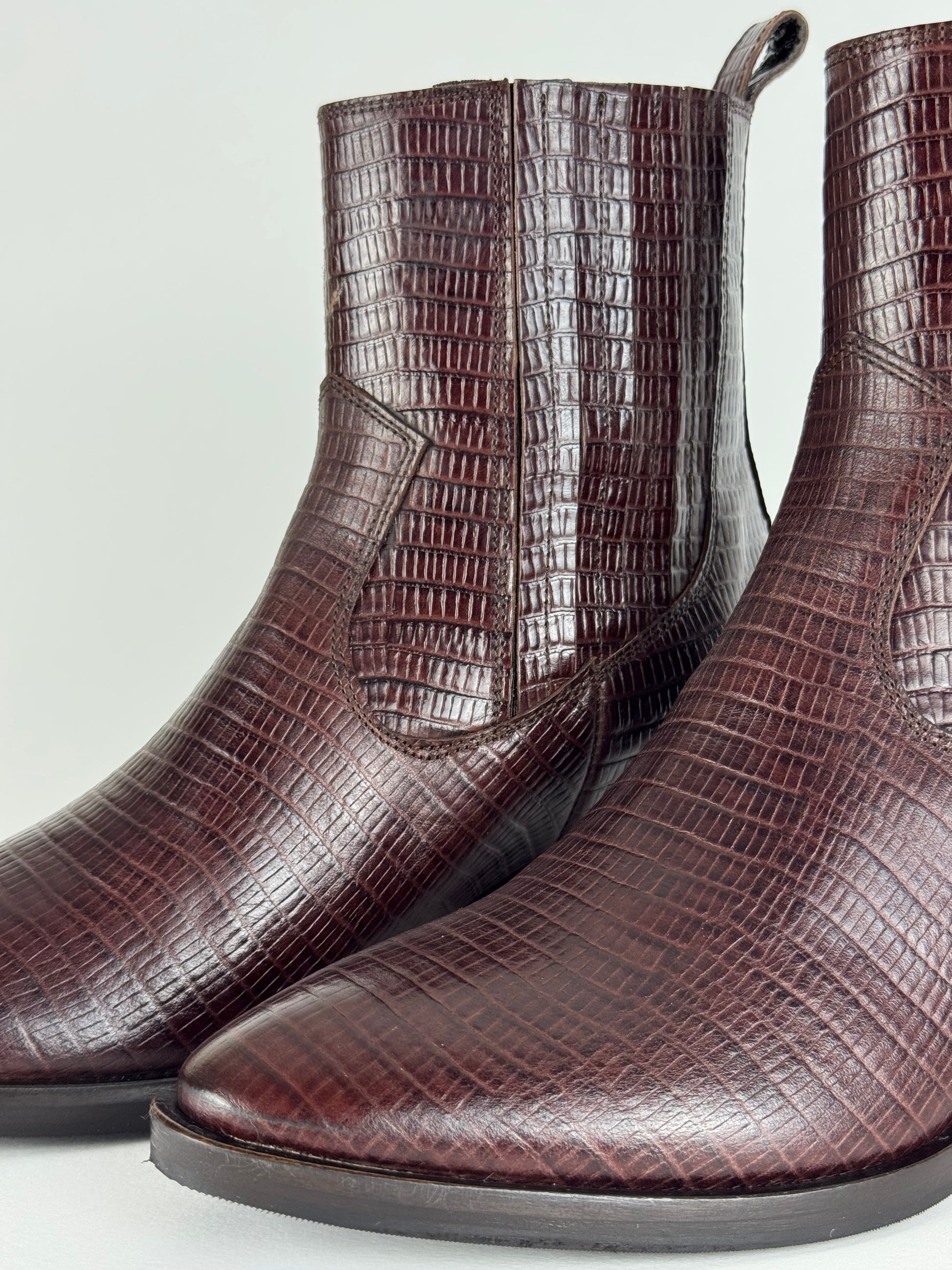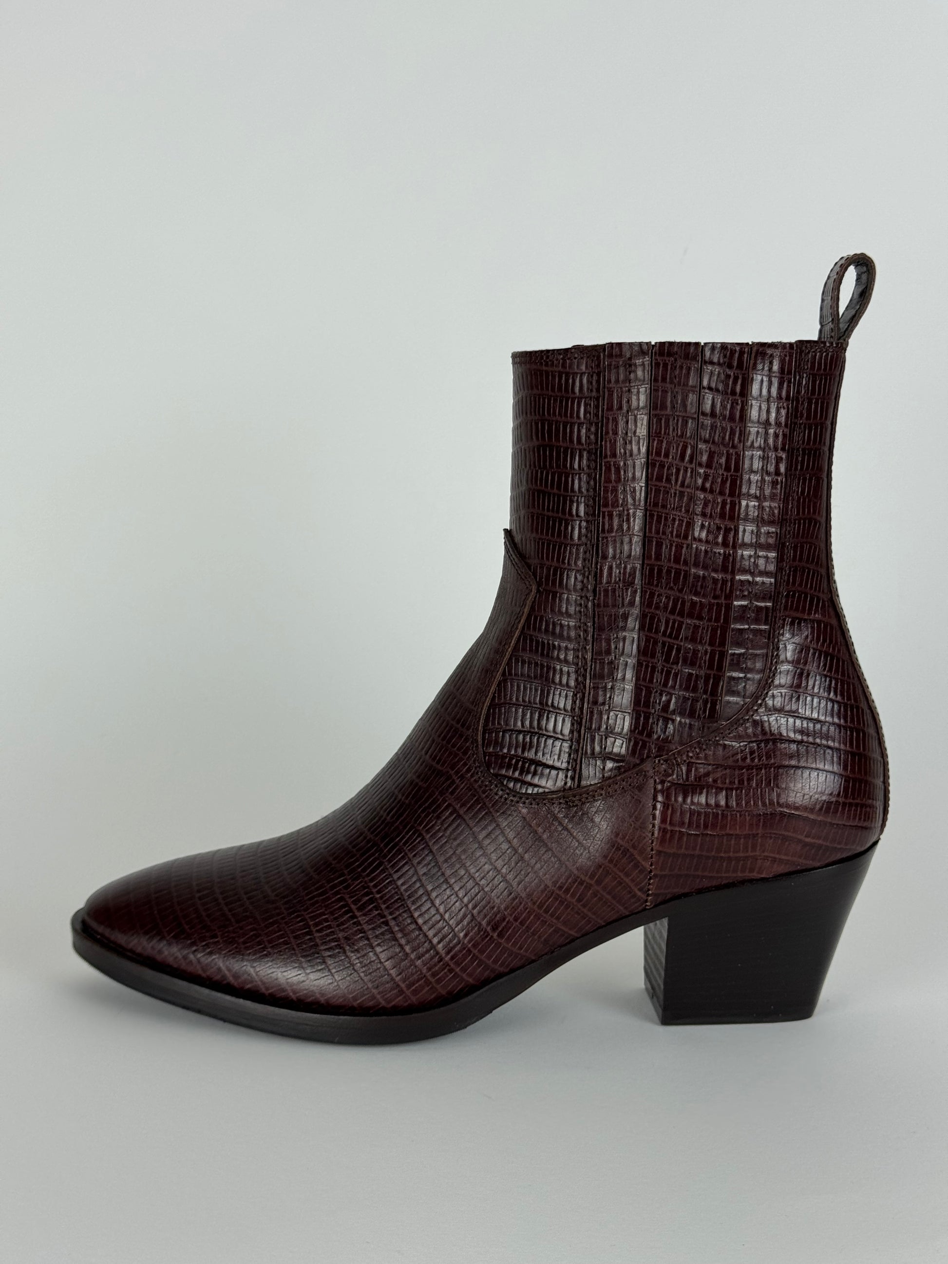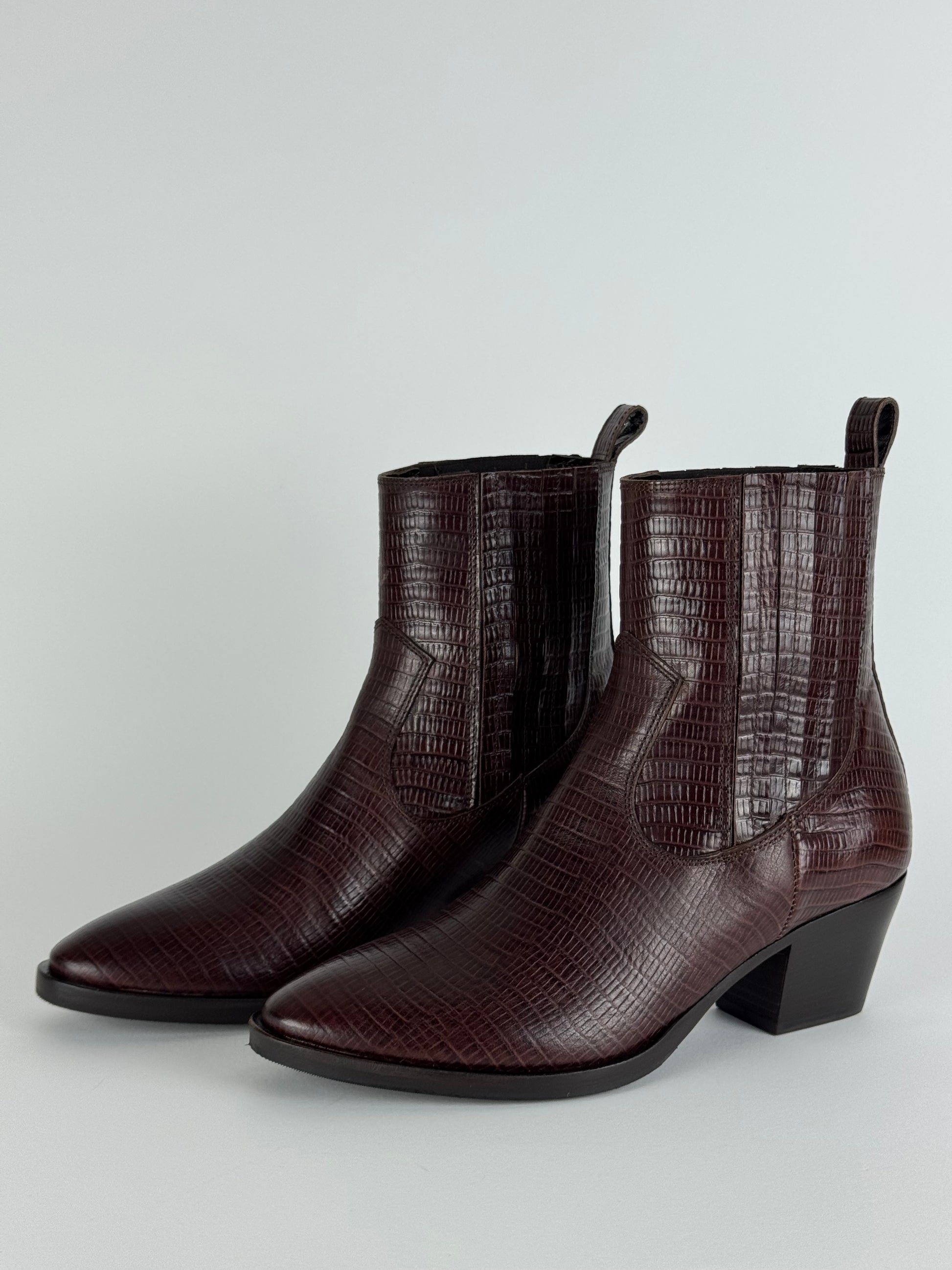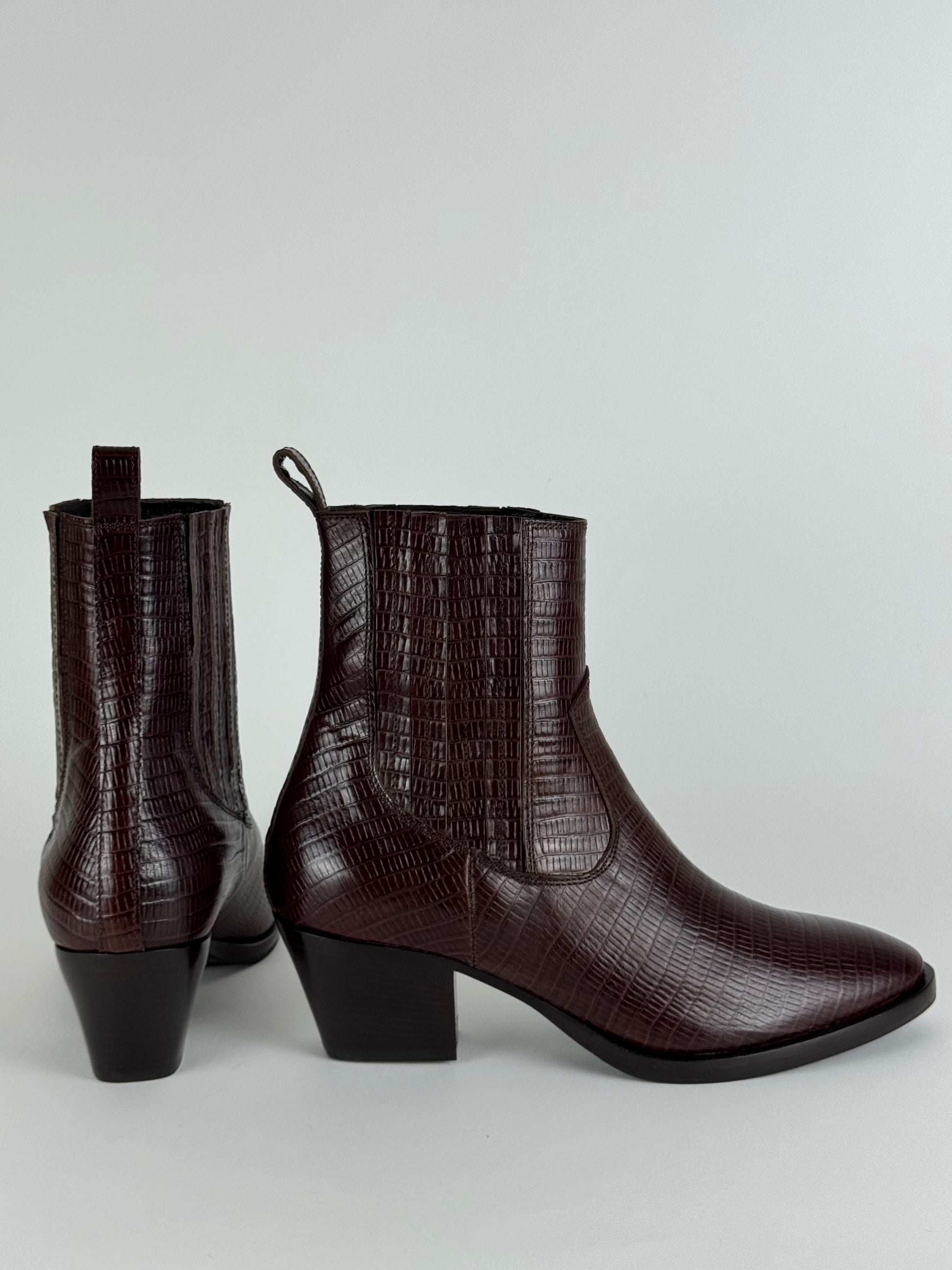 Eleganza decisa e stile senza tempo: questo stivaletto texano realizzato in pelle effetto cocco in raffinata tonalità bordeaux è il dettaglio perfetto per completare ogni look con personalità.Il tacco largo e stabile unisce comfort e femminilità, mentre gli inserti elastici laterali e il tirante posteriore assicurano una calzata pratica e veloce, ideale per l’uso quotidiano.